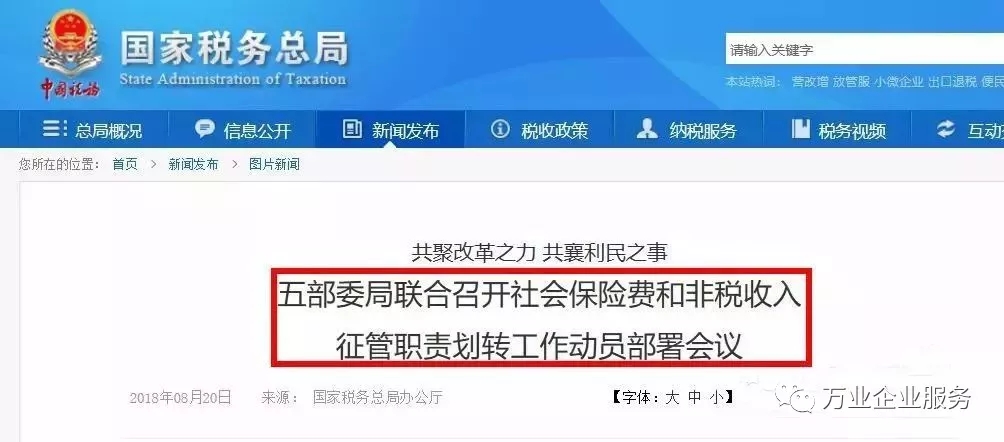 根據(jù)之前國家稅務(wù)總局、財政部、人力資源和社會保障部、國家衛(wèi)生健康委員會、國家醫(yī)療保障局視頻會議部署,今年12月10日前要完成社會保險費(fèi)和第一批非稅收入征管職責(zé)劃轉(zhuǎn)交接工作,自2019年1月1日起由稅務(wù)部門統(tǒng)一征收各項社會保險費(fèi)和先行劃轉(zhuǎn)的非稅收入。